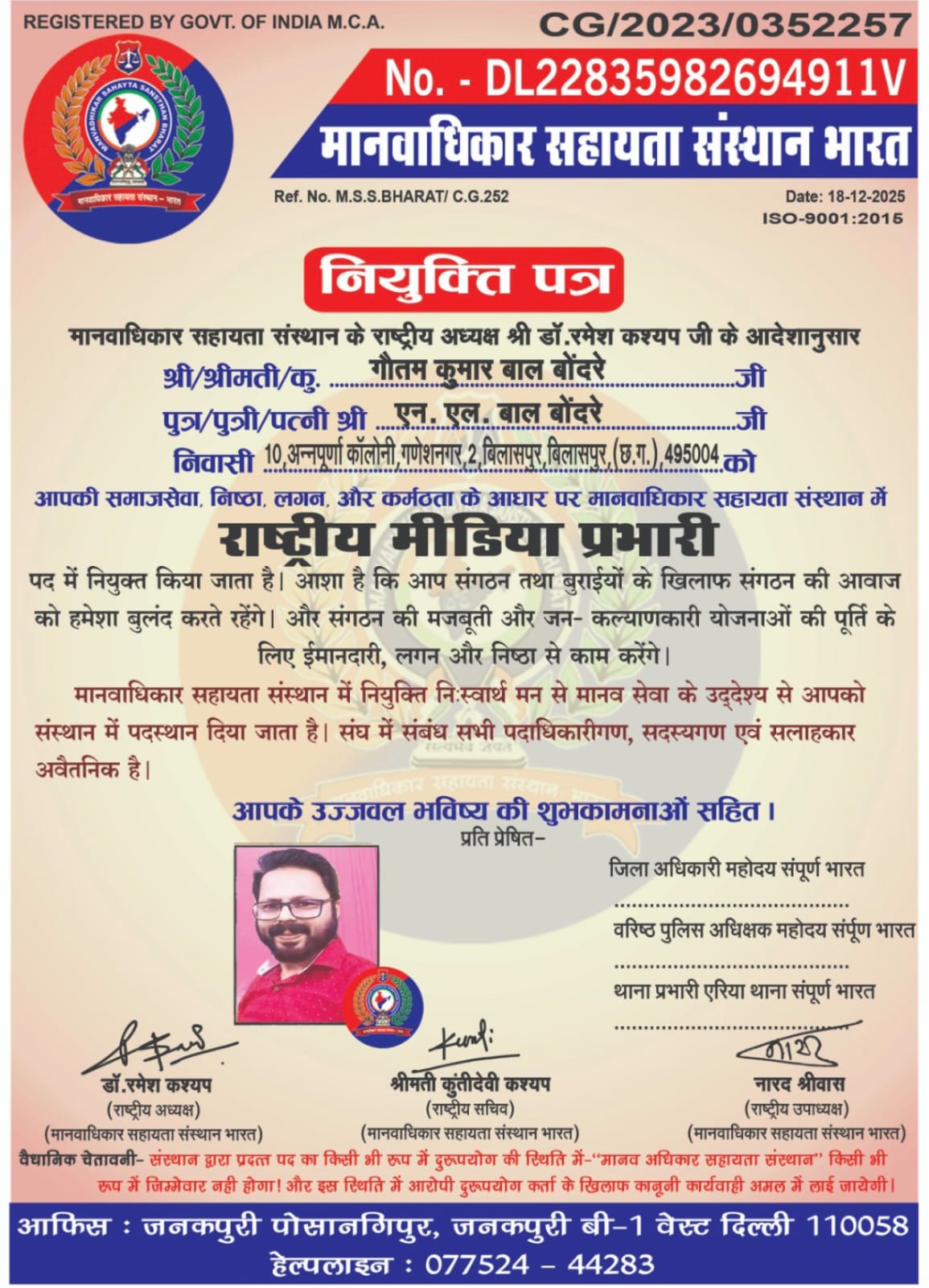 बिलासपुर :- मानवाधिकार सहायता संस्थान भारत ने संगठन को राष्ट्रीय स्तर पर और अधिक मजबूत करने की दिशा में एक अहम कदम उठाते हुए गौतम बालबोंदरे को प्रदेश मीडिया प्रभारी से पदोन्नत कर राष्ट्रीय मीडिया प्रभारी नियुक्त किया है। यह निर्णय संगठन की विचारधारा, मानवता आधारित सेवा भाव और जनसरोकारों को नई ऊंचाई देने वाला माना जा रहा है।राष्ट्रीय अध्यक्ष डॉ. रमेश कश्यप के आदेशानुसार, छत्तीसगढ़ प्रभारी कुमार राज कश्यप की अनुशंसा एवं प्रदेश अध्यक्ष धरम भार्गव की सहमति से यह नियुक्ति की गई। संगठन का मानना है कि गौतम बालबोंदरे की कार्यशैली, मीडिया के प्रति उनकी गहरी समझ और सामाजिक मुद्दों के प्रति संवेदनशील दृष्टिकोण उन्हें इस जिम्मेदारी के लिए पूर्णतः योग्य बनाता है।