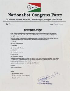 बिलासपुर :- राष्ट्रवादी कांग्रेस पार्टी छत्तीसगढ़ ने पार्टी विरोधी गतिविधियों और अनुशासनहीनता में संलिप्तता पाए जाने पर कड़ा कदम उठाते हुए चार पदाधिकारियों को पार्टी की प्राथमिक सदस्यता और सभी पदों से तत्काल प्रभाव से निष्कासित कर दिया है। यह कार्रवाई पार्टी के संविधान, संगठनात्मक अनुशासन और शीर्ष नेतृत्व के निर्देशों के तहत की गई है।